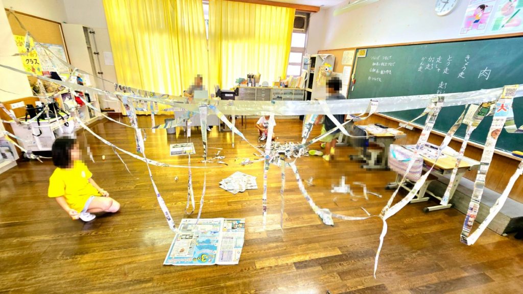 児童が思い思いに、自由に新聞紙をつなげていきます。子供の発想ならではの空間が広がっていきます。もう、夢中です!空間を自分で創り出していく面白さに夢中です!