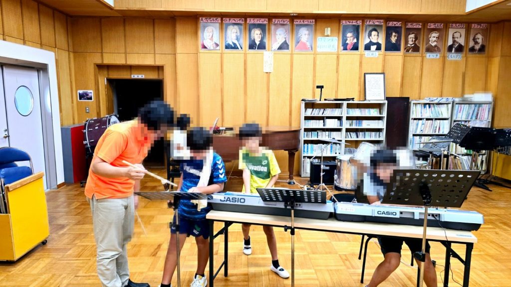 それぞれが、ピアノ・電子ピアノ・リコーダーを担当し、合奏に取り組みました。なかなか音が合わずに苦労の連続ですね。