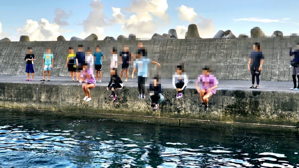 一学期には母島小中学校の6年生6名が父島を訪問し、移動教室を実施しました。今回は迎える側として、本校6年生と小笠原小学校6年生とが、脇浜で交流しました。一緒に元気よく海で泳いだり、飛び込んだりしました。