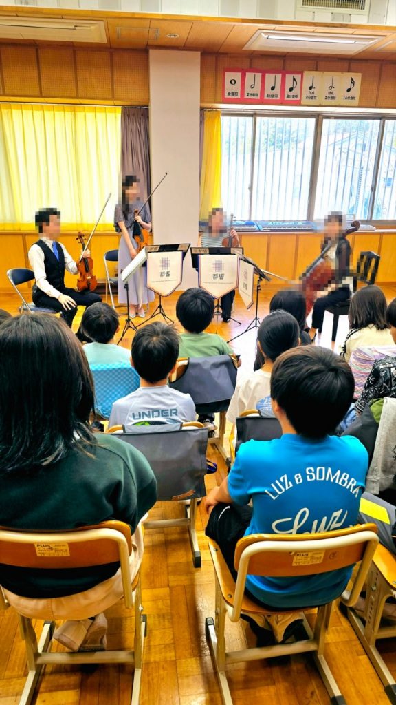 本日4校時、東京都「笑顔と学びプロジェクト」事業により、東京都交響楽団の皆さんが来校し、弦楽四重奏のミニコンサートを開催してくださりました。