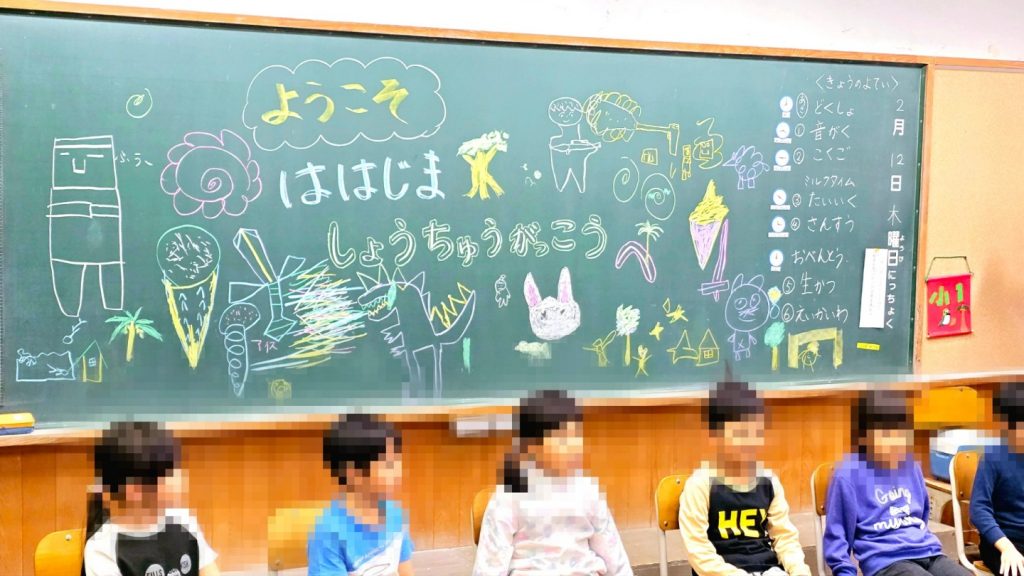 新1年生(保育園の年長さん)を出迎える言葉と絵が、教室の黒板に書かれています。新1年生も思わず笑顔です!